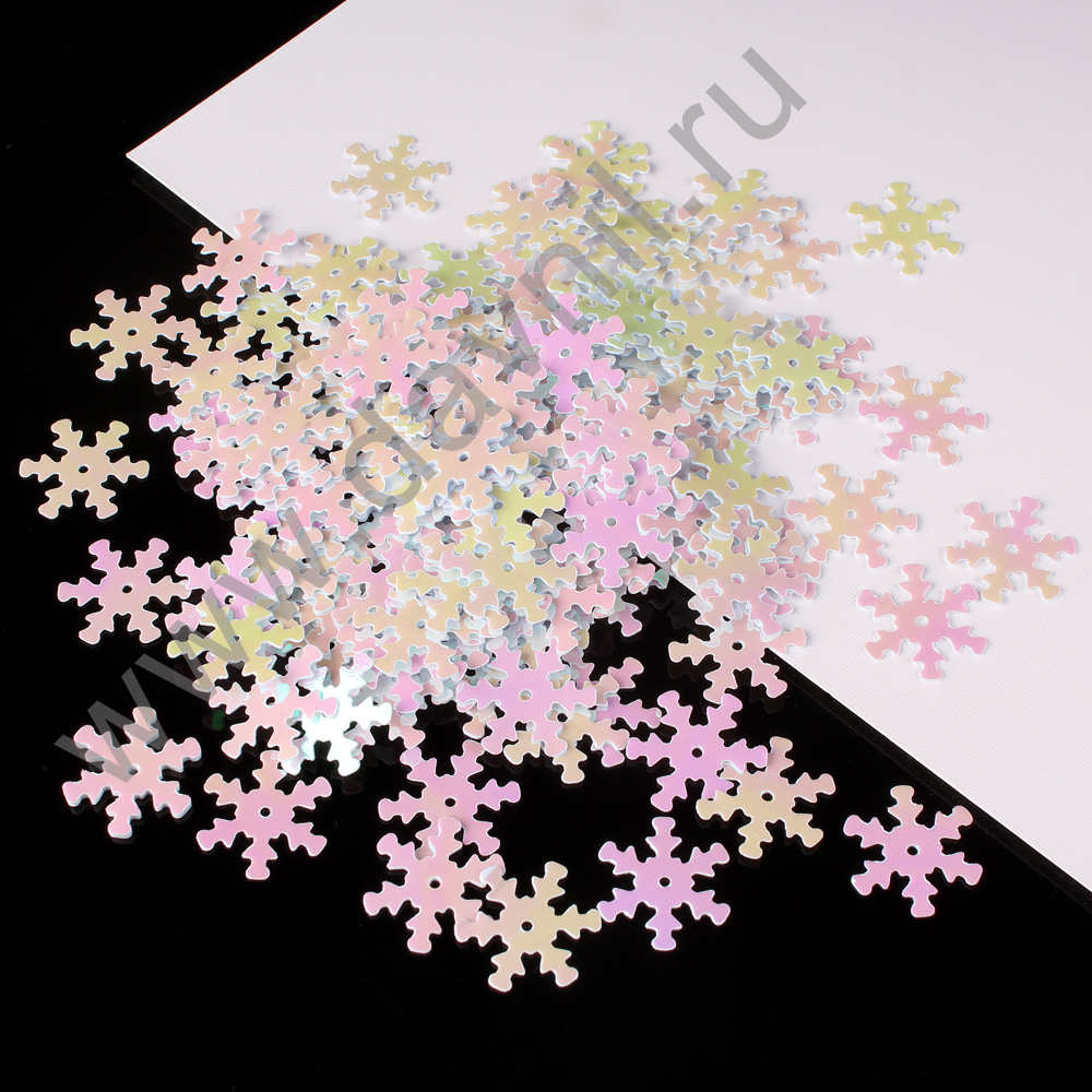Фигурные пайетки в форме снежинок, белые. Пришивные пайетки могут использоваться во многих видах рукоделия: шитье, вышивание, изготовление композиций, декорирование, упаковка и многое другое.