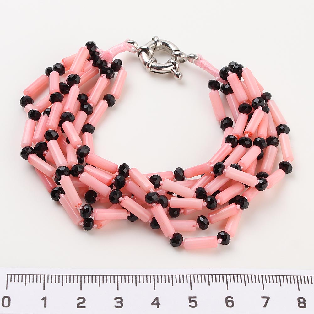 Браслет натуральный коралл розовый с добавлением чёрных хрусталиков 8 рядов