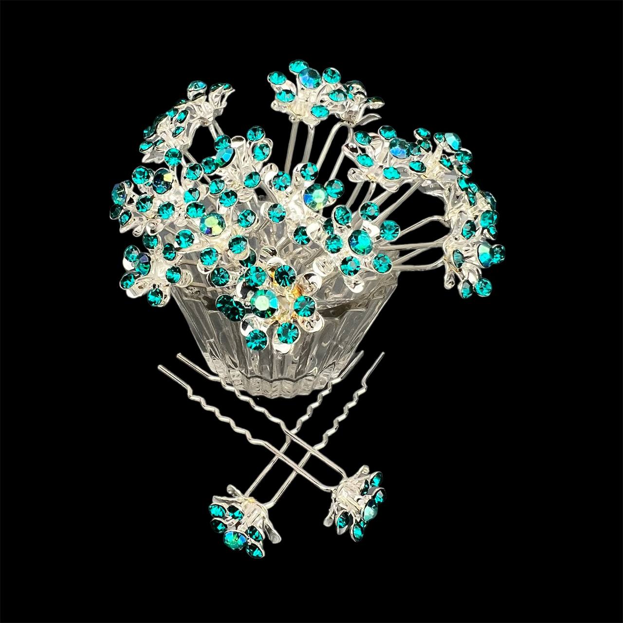 Шпильки для волос цветок из страз 15 мм 20 шт бирюзовые 26/2