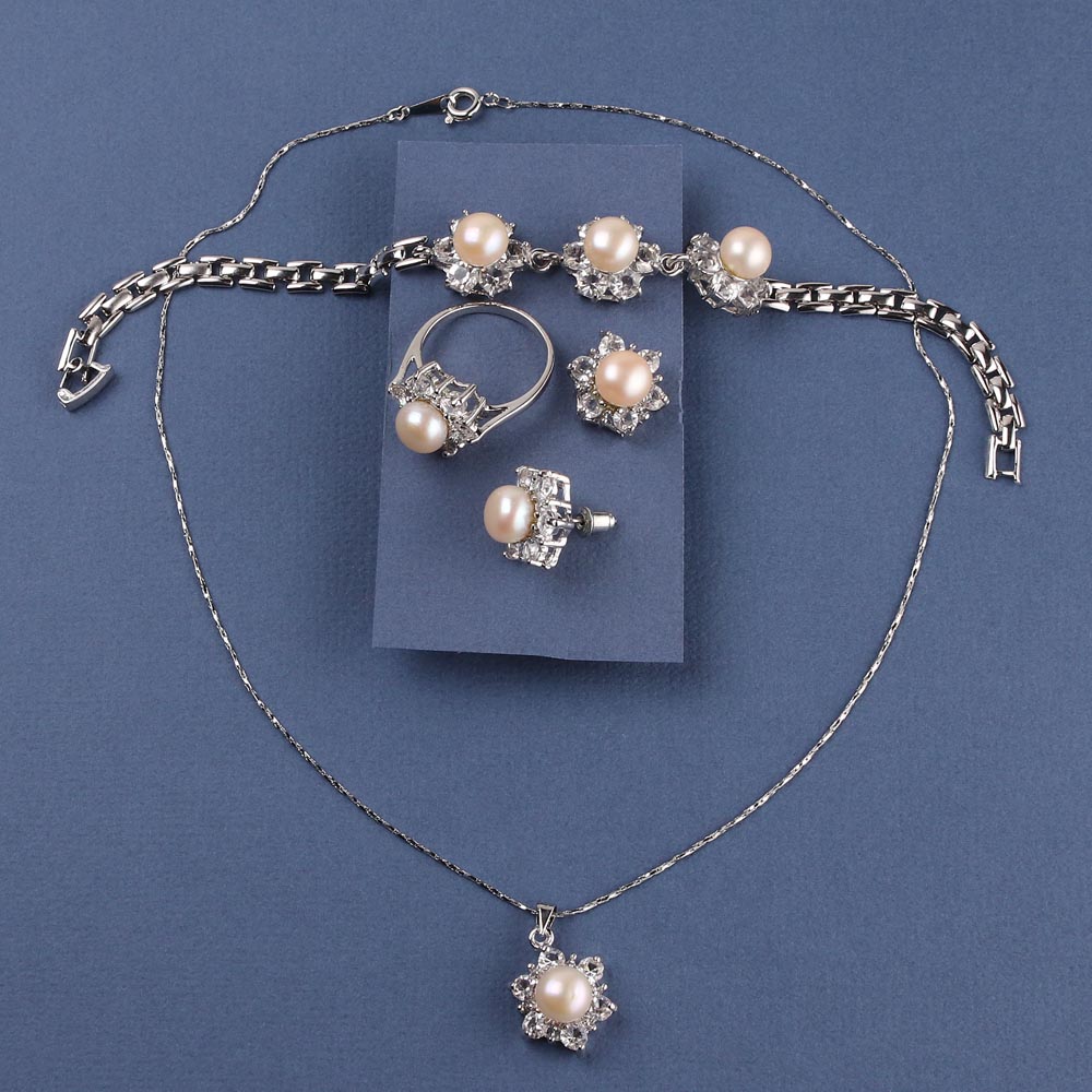Набор с жемчугом и стразами под серебро из четырех предметов