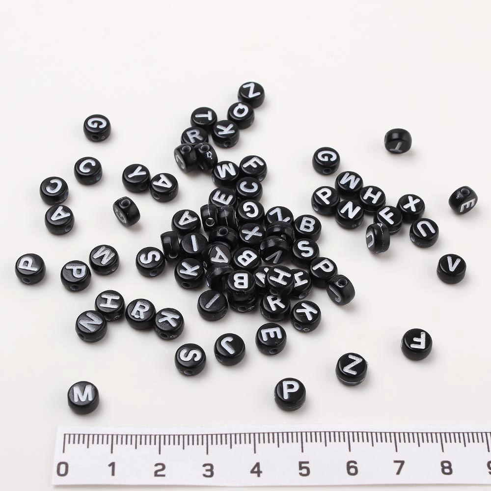 Бусины 6 мм 50 гр чёрные круглые с белыми буквами