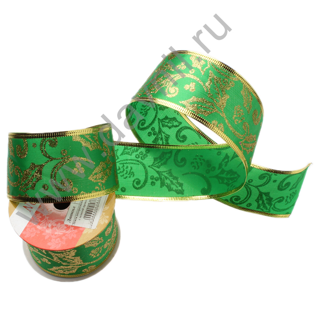 Лента декоративная с проволочным краем 5 см* 2,7 м зелёная 5/6