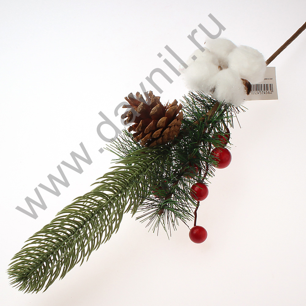 Ветка еловая с красными ягодами, шишкой и хлопком 45 см