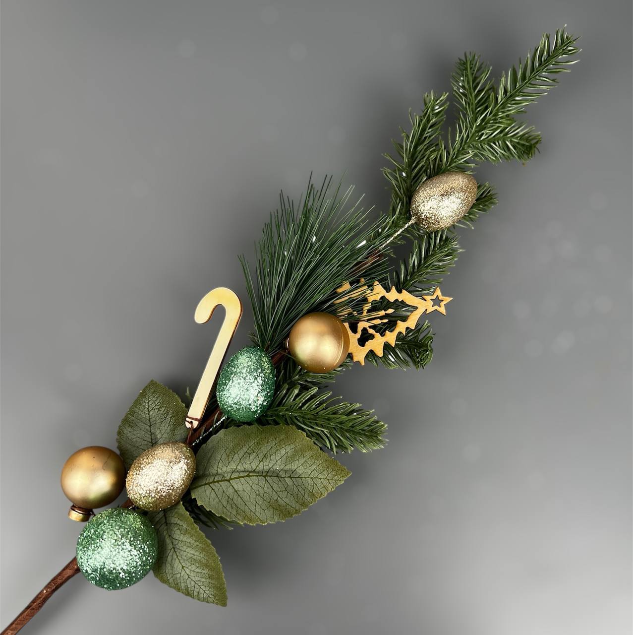 Композиция декоративной веточки, украшенной новогодними аксессуарами - это смелое решение для создания праздничного настроения. Эти веточки не только позволят вам быстро украсить ваш интерьер, но и найдут широкое применение в рукоделии. Ветки изготовлены из высококачественных материалов, которые имитируют текстуру и цвет ели.