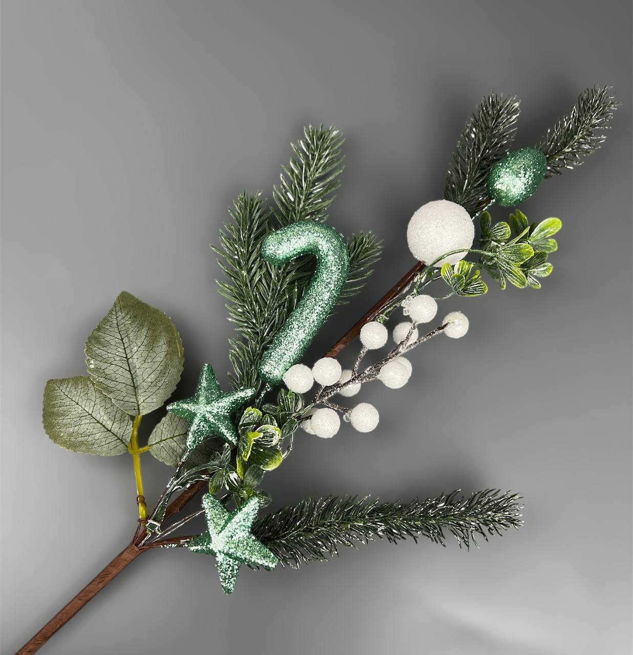 Композиция декоративной веточки, украшенной новогодними аксессуарами - это смелое решение для создания праздничного настроения. Эти веточки не только позволят вам быстро украсить ваш интерьер, но и найдут широкое применение в рукоделии. Ветки изготовлены из высококачественных материалов, которые имитируют текстуру и цвет ели.