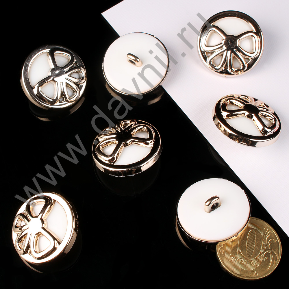Пуговица 25 мм на ножке белая в золотой оправе с бантиком 10 шт