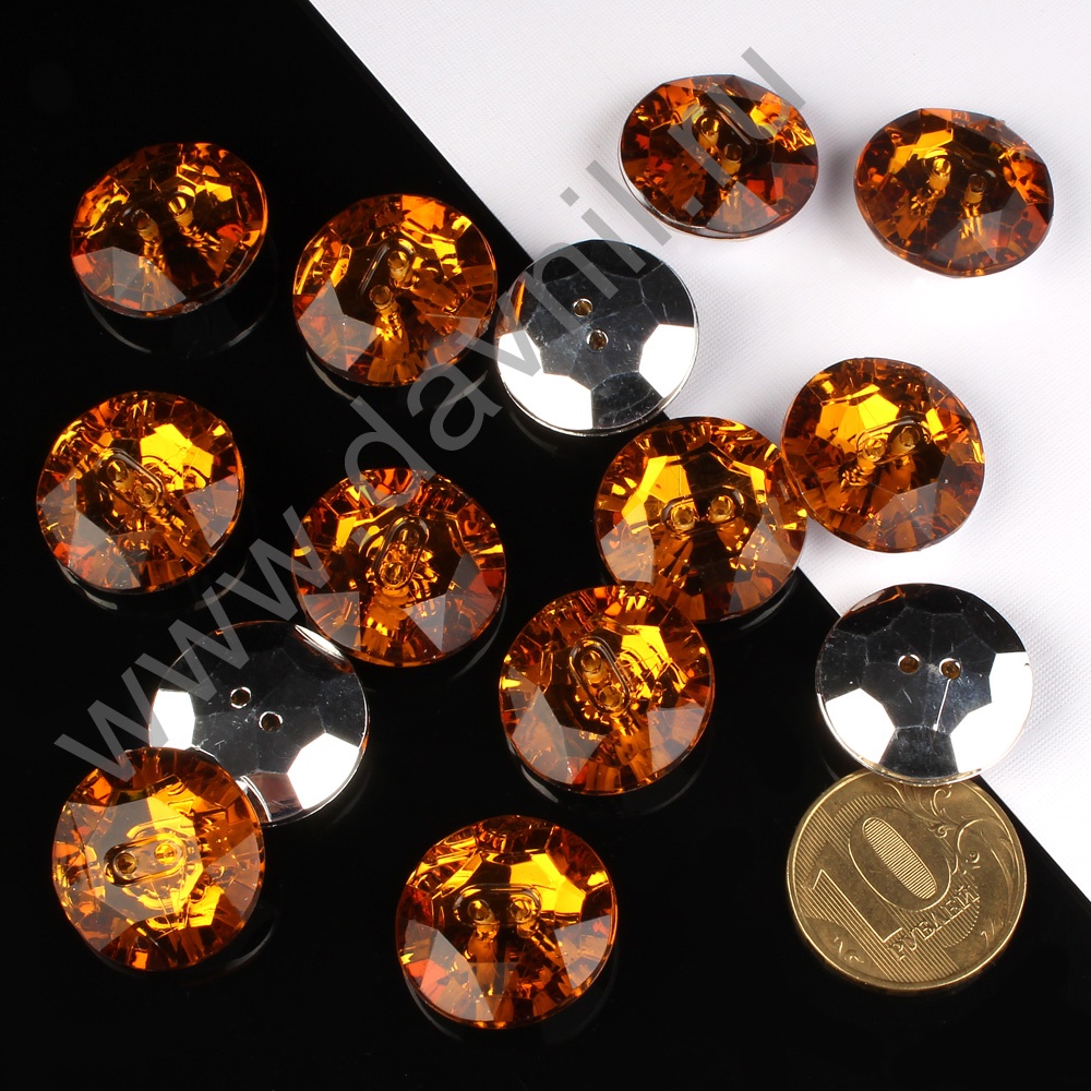 Пришивные стразы-пуговицы имеют отверстия по краям и овальное дно, прикладываются к нужной ткани. Крепятся на поверхность путем пришивания с помошью иголок с нитками. Имеют широкое применение: ими украшают платья, костюмы, купальники для гимнастики, свадебные платья, картины со стразами, предметы мебели и т. д.
