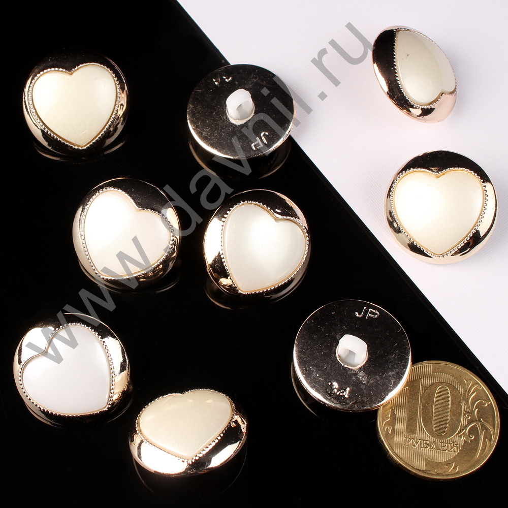 Пуговица 20 мм на ножке сердечко жемчуг в золотой оправе 200 шт