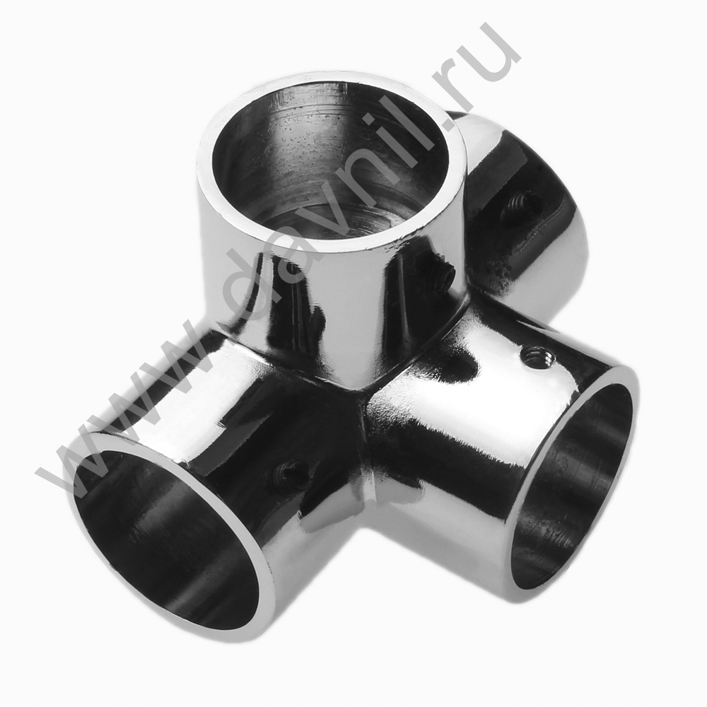 Металлический переходник для 4-х труб.В основе лежит хромированная труба диаметром 30 мм. Из неё, при помощи большого количества различных соединителей можно создать практически любую пространственную конструкцию. Сфера применения значительно расширяется, поскольку она прекрасно сочетается с системами торгового оборудования.