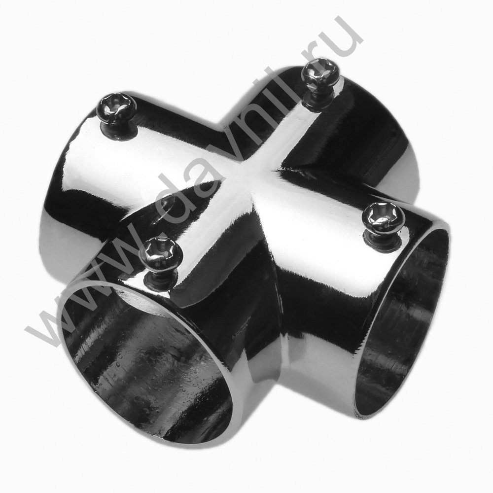 Металлический переходник для 4-х труб.В основе лежит хромированная труба диаметром 27 мм. Из неё, при помощи большого количества различных соединителей можно создать практически любую пространственную конструкцию. Сфера применения значительно расширяется, поскольку она прекрасно сочетается с системами торгового оборудования.