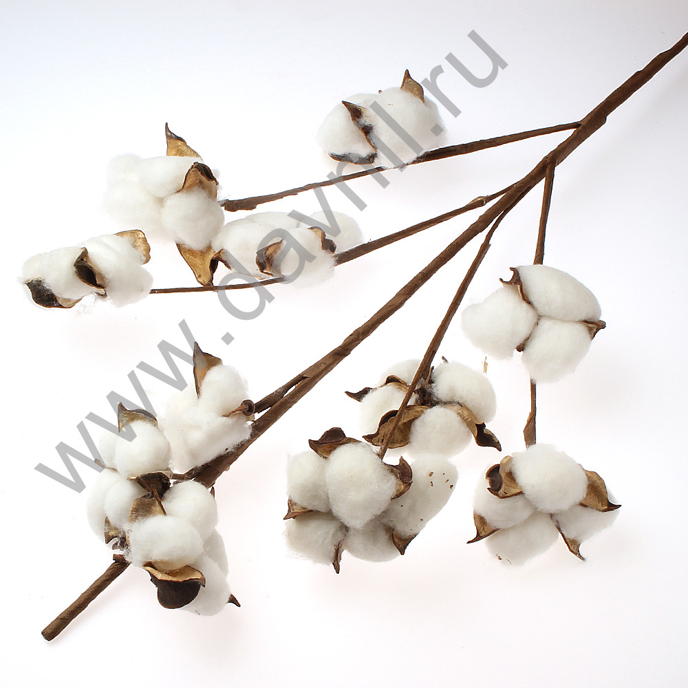 Декоративная ветка хлопка. Используют в создании цветочных композиций, в оформлении помещений. Часто используют в оформлении свадеб в стиле эко и рустик. Сочетается как с живыми, так и искуственными цветами, гармонирует с мешковиной, бусами, лентами. В 1 коробке 100 шт