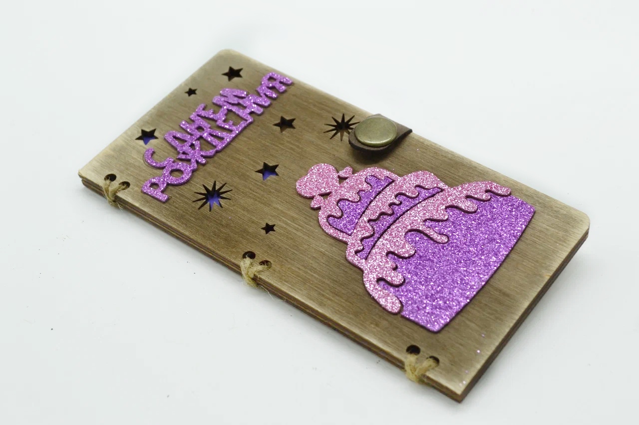 Конверт деревянный " Глитерный торт сиреневый с розовым "