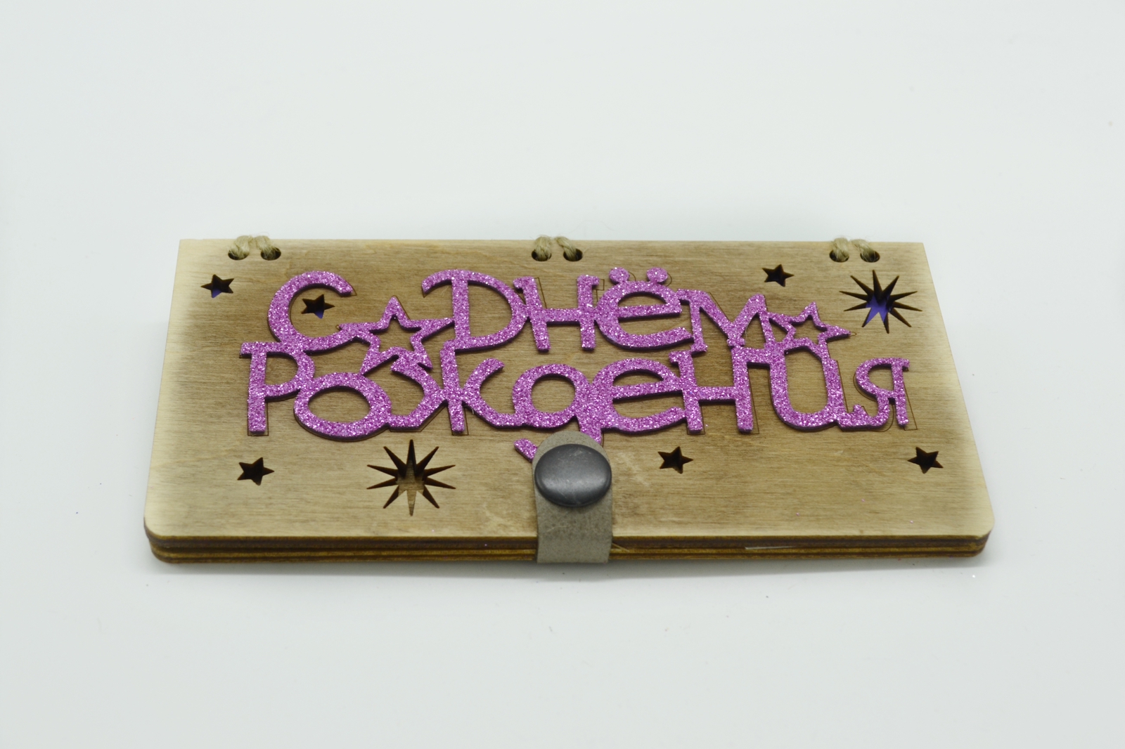 Конверт деревянный " С днём рождения ! " сиреневый глитер